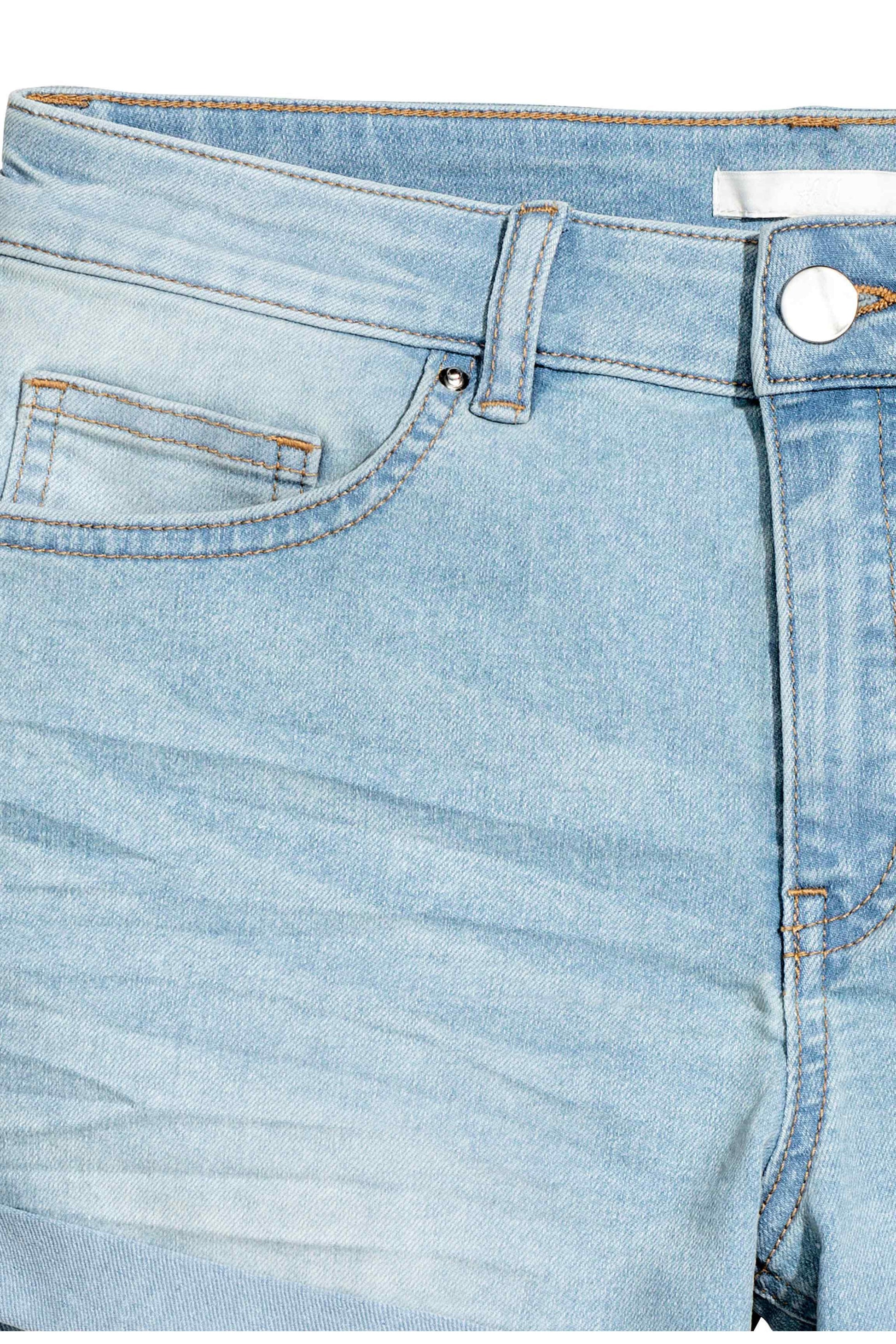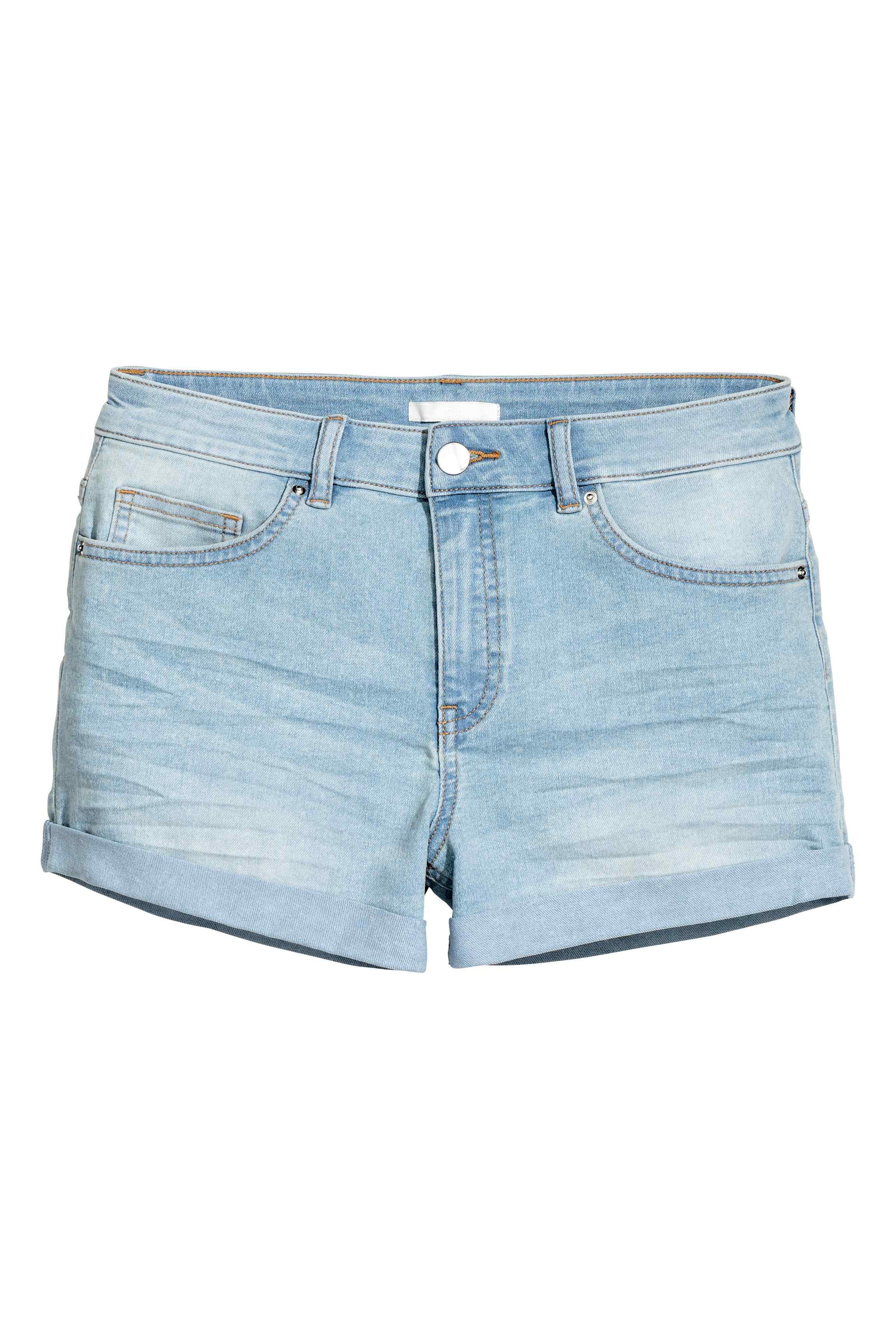 Short, low-rise 5-pocket shorts in washed superstretch denim with a zip fly and button and sewn-in turn-ups at the hems.